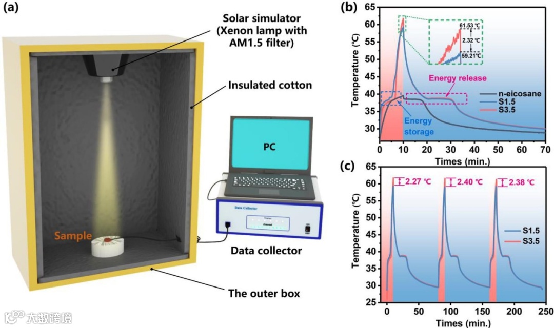 图5. 自制的光热转换实验装置和MPCM的光热转换实验结果