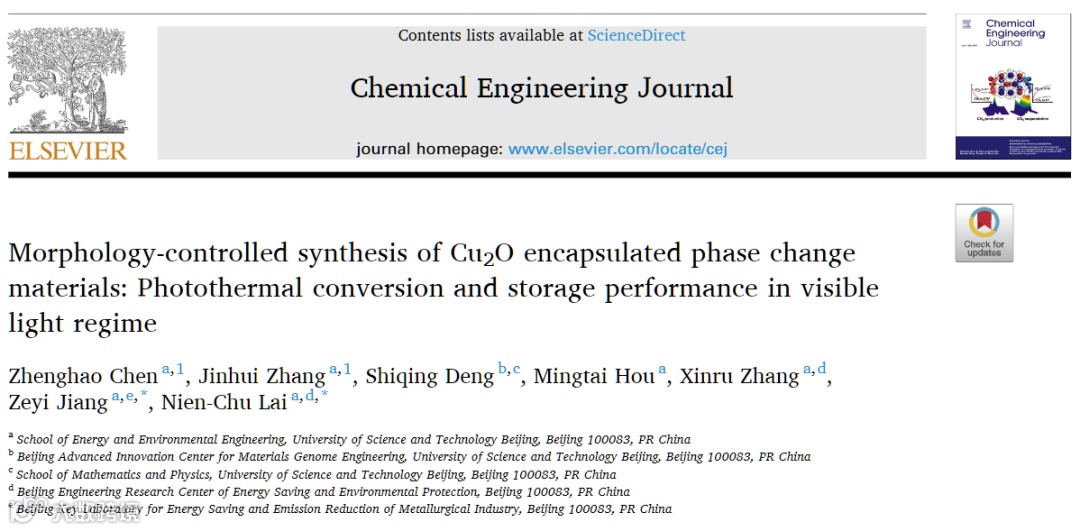 基于此,来自北京科技大学的姜泽毅教授与赖念筑副教授在国际知名期刊Chemical Engineering Journal上发表题为“Morphology-controlled synthesis of Cu2O encapsulated phase change materials: Photothermal conversion and storage performance in visible light regime”的研究论文。