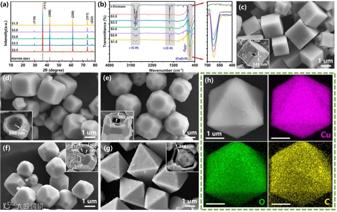 氧化亚铜(Cu2O)具有成本低、导热系数高、毒性低、直接禁带宽度为2.0-2.2 eV等优点,是一种重要的p型半导体材料,其由不同晶面主导的形貌特性由于其晶面特有的性质,是研究基于形态的催化、太阳能转换和传感器应用的理想材料。探索Cu2O包裹MPCM的晶面相关的光学性质是很有意义的。考虑到可能会形成固体Cu2O颗粒,控制乳液模板体系与铜离子之间的相互作用以及壳层前驱体的沉淀动力学是制备形貌可控的Cu2O包覆MPCM的难点。