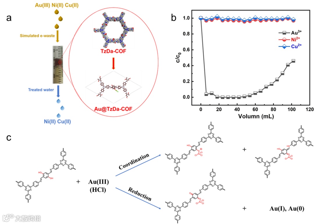 图1. TzDa-COF作为填充柱的对模拟电子废液中金的动态吸附效果以及吸附机理。