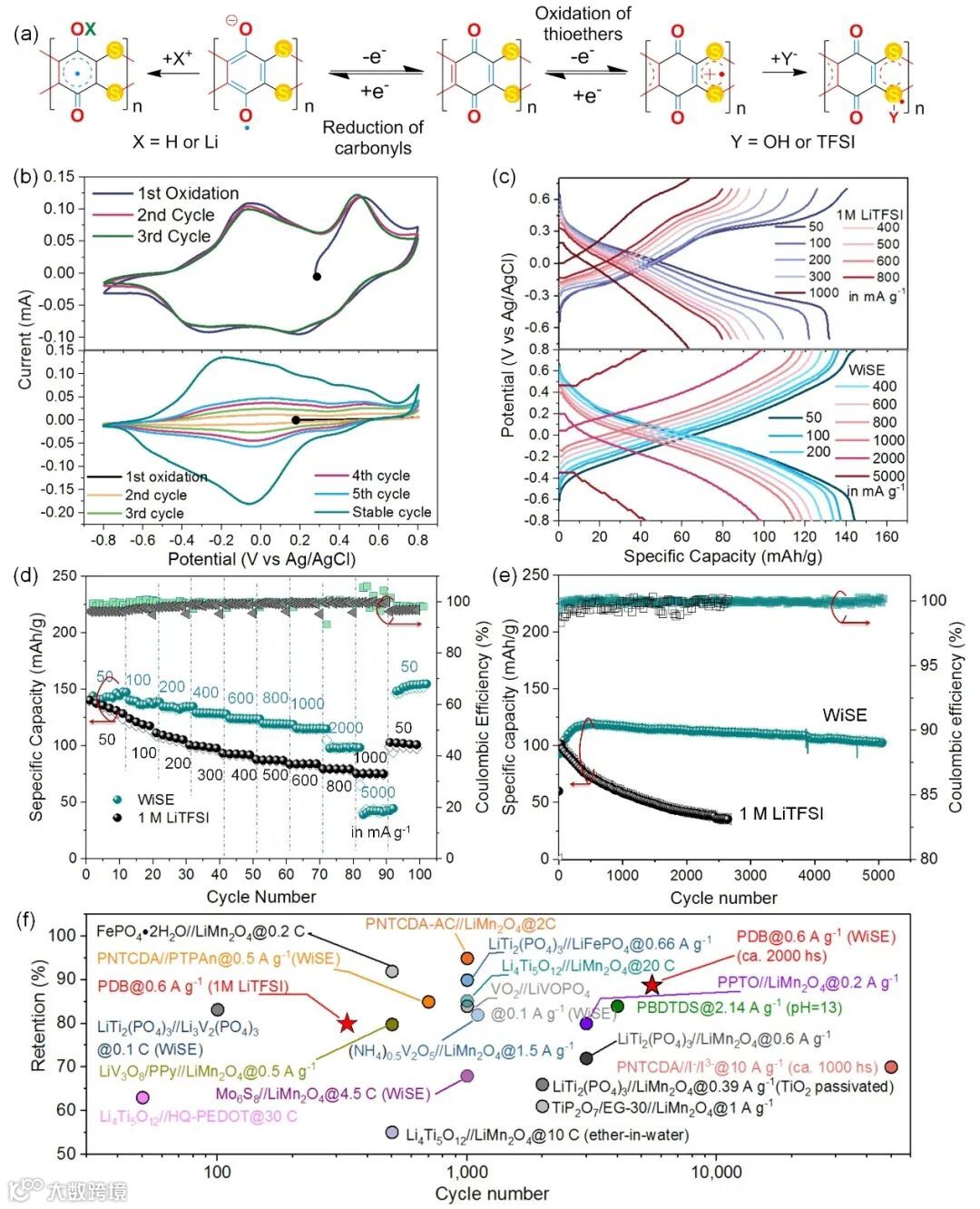 Figure 1. Electrochemical performance of dual−ion storage in PDB. (a) Proposed mechanism for dual−ion storage in PDB. (b) Three-electrode cyclic voltammetry (CV) curves of PDB electrodes in both 1M LiTFSI (first 3 cycles) and WiSE (first 5 and stable cycles) at a scan rate of 0.2 mV s−1. The scanning potential window ranges from –0.8 V to +0.8 V (vs. Ag/AgCl). The CV sweep starts from the open-circuit potentials (0.28 and 0.18 V for the PBD electrodes in 1M LiTFSI and WiSE, respectively). (c) Galvanostatic measurements of PDB electrodes with different current densities in 1M LiTFSI (up panel, from 50 to 800 mA g−1) and WiSE (bottom panel, from 50 to 5000 mA g−1). (d) The rate performance and columbic efficiency of PDB electrodes in 1M LiTFSI (black dot) and WiSE (green dot). (e) Cycle stability of PDB electrodes at a current density of 600 mA g−1. (f) Comparison of cycle stabilities of PDB electrodes with reported ALIBs.
