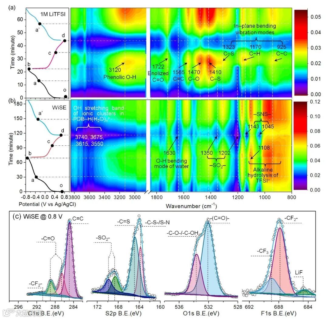 Figure 4. ATR−FTIR and XPS Analysis. In-situ FTIR spectra of PDB electrode in 1M LiTFSI (a) and WiSE (b) at various discharged/charged states during the galvanostatic cycles. All the electrochemical tests for characterization were conducted at a current density of ca. 100 mA g−1. (c) The C 1s, S 2p, O 1s, and F 1s XPS spectra of PDB electrode @ 0.8 V in WiSE using a charge current density of 100 mA g−1.