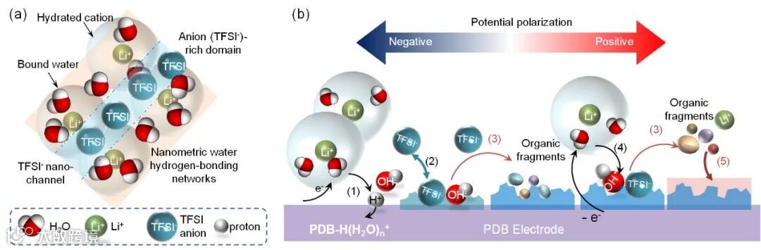 Figure 6. SEI-forming mechanism on PDB electrode. (a) Schematic diagram of the nanonetwork structures of WiSE with hydrated cation and nonaqueous anion-rich domains and the Li+ solvation structure. (b) Schematic illustration of the formation of the SEI involving the proton co-intercalation (1, under negative polarization), precipitation/dissolution (2) and decomposition (3) of TFSI−, OH− radical generation (4, under positive polarization) and fluorinated/oxygenated lithiation salt deposition (5).