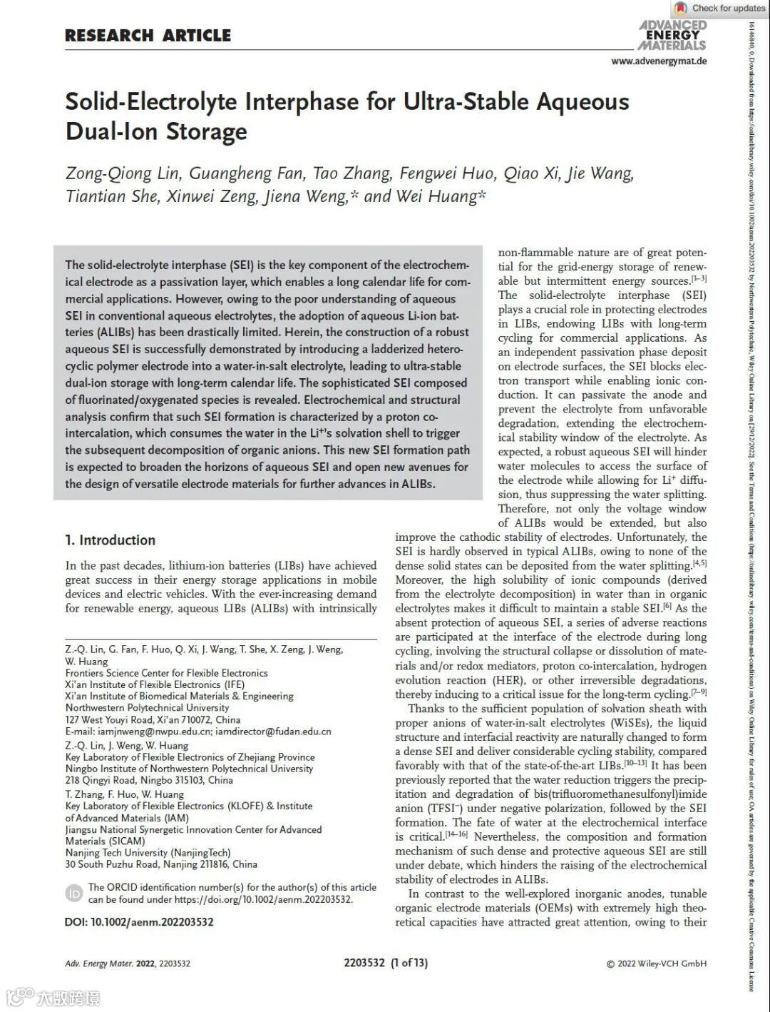 基于此,来自西北工业大学的林宗琼教授、翁洁娜副教授与黄维院士团队,在国际知名期刊Advanced Energy Materials上发表题为“Solid-Electrolyte Interphase for Ultra-Stable Aqueous Dual-Ion Storage”的观点文章。