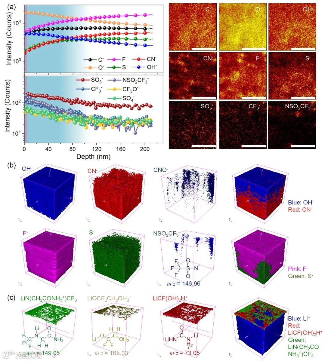 Figure 5. ToF-SIMS Analysis. (a) Depth profiles of SEI fragments on PDB electrode (WiSE @ 0.8 V) plotted versus normalized sputter depths from 80-cycle half cells. (b) Chemical maps of different fragment ions of cycled PDB electrode. (c, d) 3D images reconstruction from ToF-SIMS depth profile experiments showing the spatial distributions of OH–, CN–, CNO–, F–, S– and NSO2CF3– in negative ion mode (c) and organolithium in positive ion mode (d).