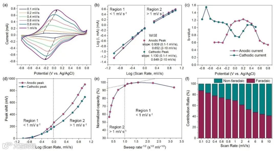 Figure 2. Kinetic analysis of the electrochemical behavior of PDB in WiSE. (a) Cyclic voltammograms of PDB electrode with different scan rates (0.1 to 1 mVs−1). (b) b-value determination of the peak anodic and cathodic currents of PDB in two distinct kinetic regions with different scan rates (0.1 to 1 mV s−1 and 1 to 10 mV s−1). (c) Calculated b-values as a function of potential for the cathodic and anodic sweep. (d) Anodic and cathodic peak shifts at different sweep rates, showing small shifts at rates below 1 mV s−1. (e) Capacity versus ν1/2 allows for the separation of diffusion-controlled capacity from capacitive-controlled capacity. (f) Faradaic and non-faradaic contribution ratios of PDB electrode.
