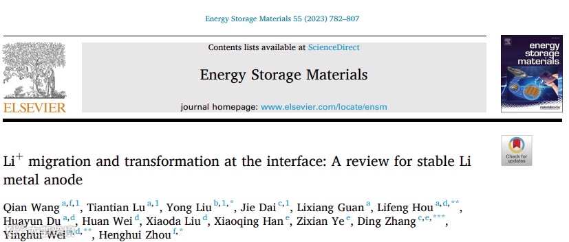 Qian Wang,TiantianLu,YongLiu,JieDai,LixiangGuan,LifengHou,HuayunDu,HuanWei,XiaodaLiu,XiaoqingHan,ZixianYe,DingZhang,YinghuiWei,HenghuiZhou.Li+ migration and transformation at the interface: A review for stable Li metal anode.Energy Storage Materials,2023