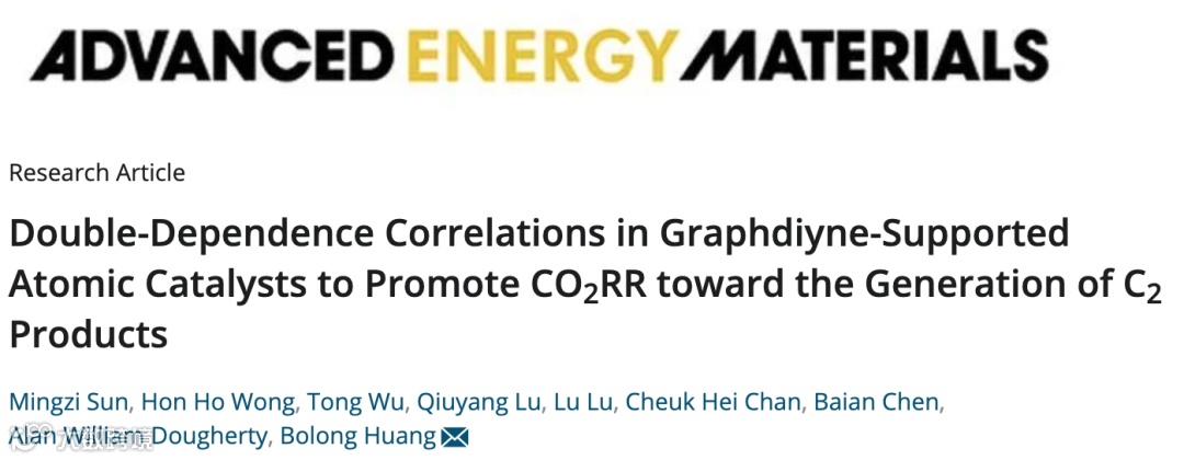 基于此,来自香港理工大学的黄勃龙教授团队在国际知名期刊Advanced Energy Materials上发表题为“Double-Dependence Correlations in Graphdiyne-Supported Atomic Catalysts to Promote CO2RR toward the Generation of C2 Products”的研究文章。该研究文章利用理论计算手段在石墨炔原子催化剂上对全C2产物的反应趋势进行了全面的解析,提出了大小集成循环机制并发现了双重依赖关联性来理解复杂的二氧化碳还原反应机制。