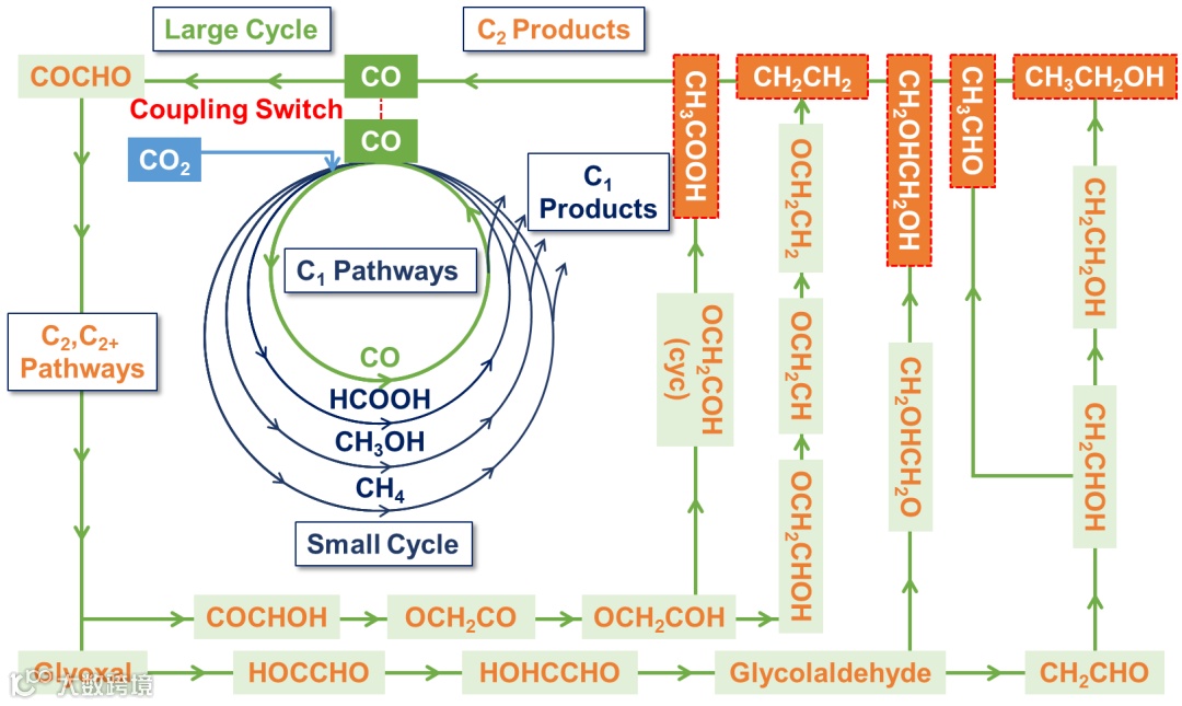 图1. 本研究工作提出的大小集成循环机制用于解释C2反应路径选择性与法拉第效率低的难题。