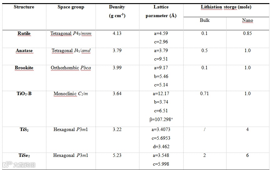 表1 TiO2常见多晶型、TiS2和TiSe2的结构和电化学性能