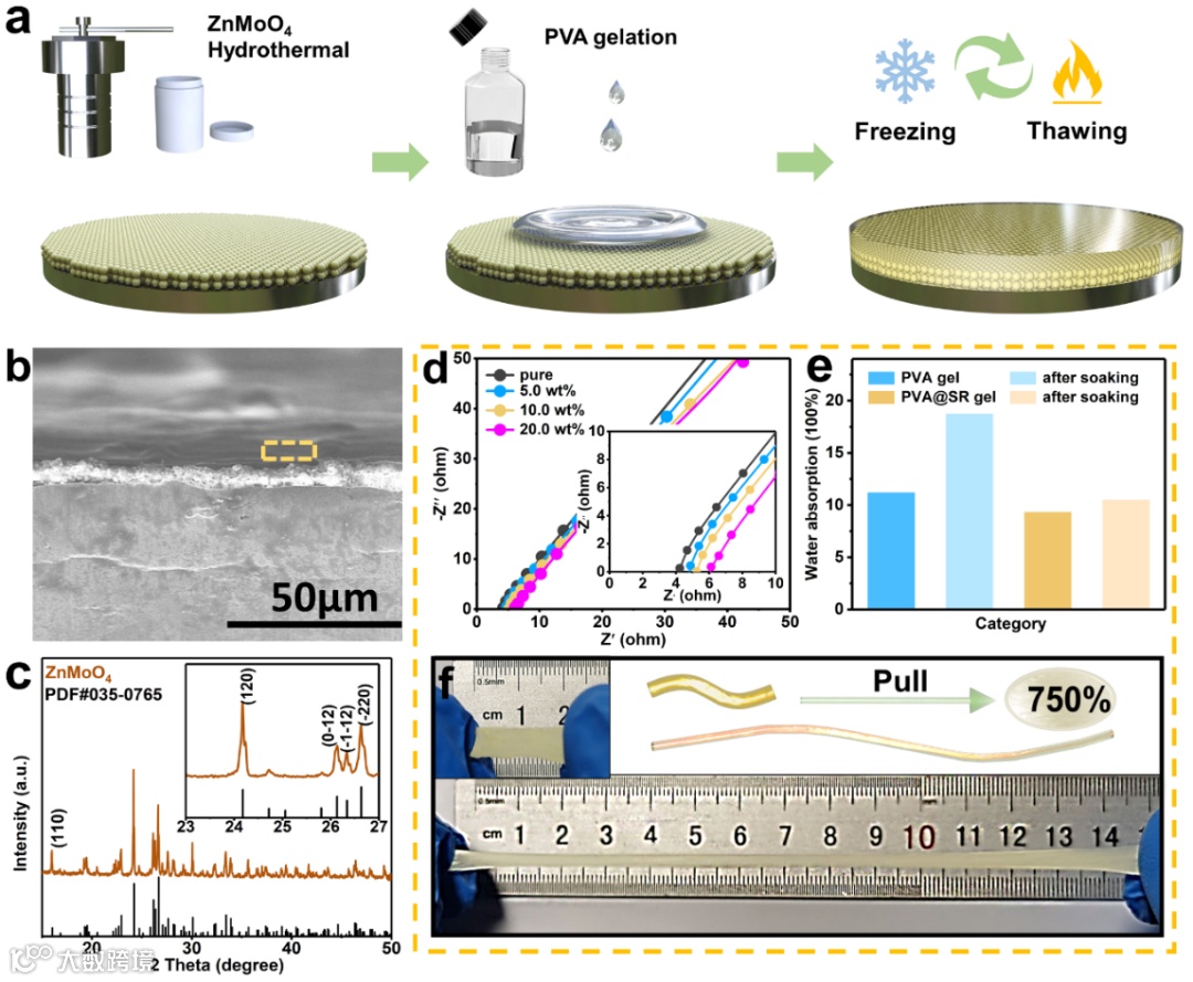 图2. (a) 类SEI结构修饰层改性锌负极的制备过程示意图;(b) 类SEI结构修饰层的SEM照片;(c) ZnMoO4的XRD谱图;(d) 不同SR添加量的PVA凝胶的EIS谱;(e) 纯PVA和SR改性PVA的吸水性测试;(f) PVA@SR凝胶的延展性。