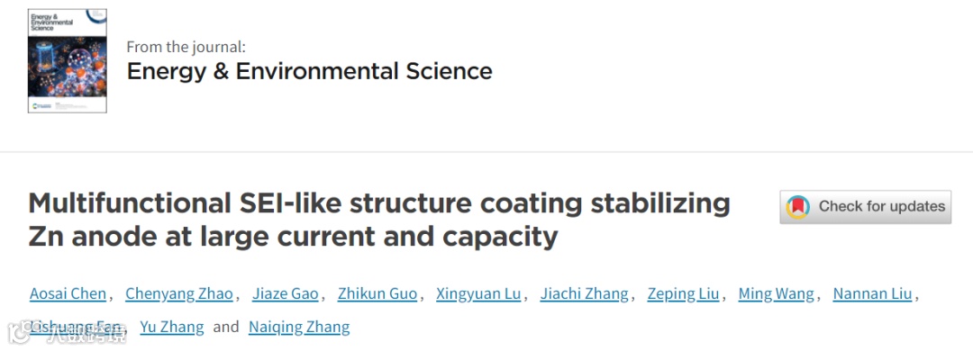 基于此,哈尔滨工业大学的张乃庆课题组在Energy & Environment Science期刊上发表题为“Multifunctional SEI-like bilayer structure coating stabilizing Zn anode at large current and capacity”的观点文章。