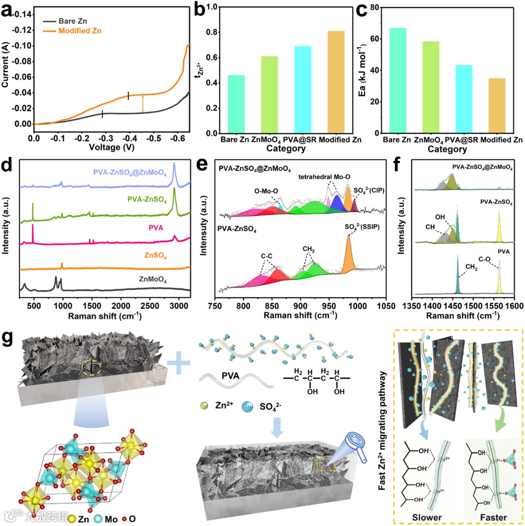图3. (a) 极限扩散电流测试,(b) Zn2+迁移数;(c) 锌负极电极反应活化能;(d-f) Raman光谱;(g) Zn2+在混合内层的ZnMoO4/PVA界面快速迁移示意图。