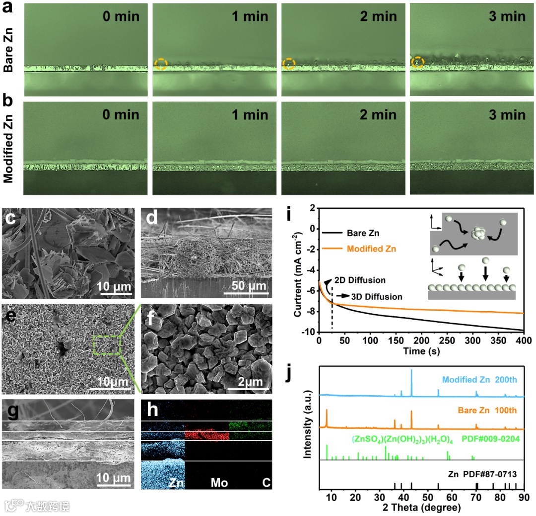 图4. (a) 裸锌与 (b) 改性锌负极在50mA cm-2下沉积形貌的原位监测;0.25 mA cm-2下,沉积面容量为5.0 mAh cm-2时 (c, d) 裸锌与 (e-h) 改性锌负极的SEM照片;(i) 计时电流曲线;(j) 循环后电极的XRD谱图。