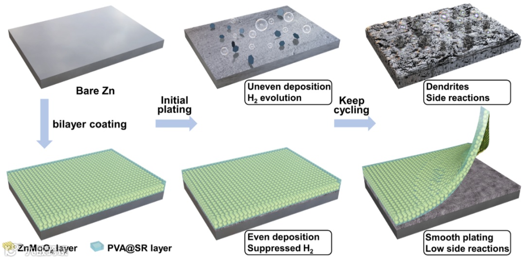通过构筑类SEI结构修饰层(外层:方酰胺衍生物掺杂的PVA凝胶;内层:ZnMoO4-PVA混合层)来稳定锌负极高倍率、高面容量循环。PVA外层可以起到胶黏作用,使修饰层适应高面容量循环条件下负极的体积变化。同时,PVA中的方酰胺衍生物SR可以捕获电解液中的SO42-并增强Zn2+的迁移与分散。