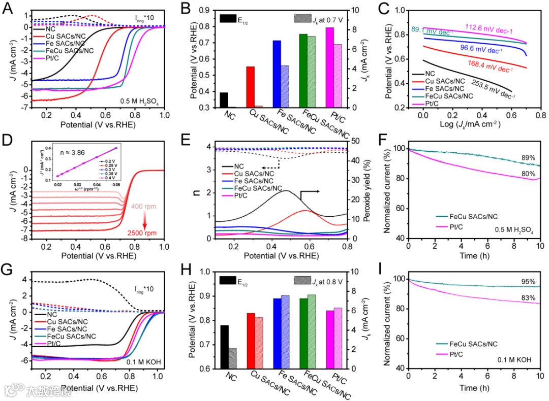 图2 所制备催化剂在酸性和碱性条件下的ORR催化性能表征。