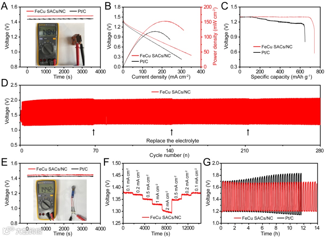 基于FeCu SACs/NC所组装的锌-空气电池展现了高的开路电位(1.48 V)和最大功率密度为(153 mW cm-2),优于 Pt/C(1.44 V,119 mW cm- 2)。
