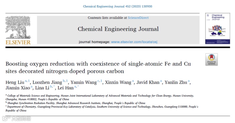 为了进一步提高Fe-N-C的ORR催化活性, 研究者发现通过引入第二种活性位点(Co, Ni, Mn等)形成双金属单原子活性位点,利用其协同作用可促进催化活性的进一步提升。基于此,来自湖南大学的韩磊教授与中国科学院上海高等研究院李丽娜研究员合作,利用泡沫金属作为金属源,结合水热法和热解策略获得原子级分散的FeN4和CuN4共存的双原子位点结构,从而显著提升ORR催化性能。