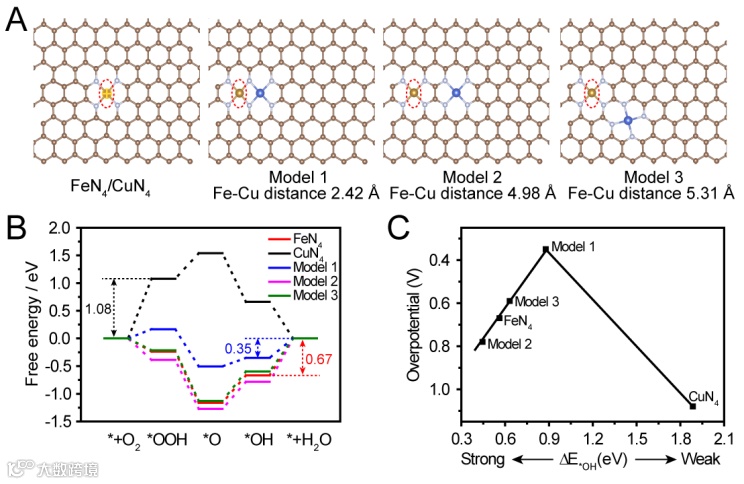 所得FeCu SACs/NC催化剂在酸性和碱性介质中均表现出更强的ORR活性(在碱性和酸性介质中的半波电位分别为0.89和0.75 V),优于单分散的Fe SACs/NC催化剂。同时,理论计算和实验结果表明,Cu的引入有利于*OH中间过程的解吸和增加Fe活性位点的密度,从而有效地增强对ORR的内在活性和选择性。