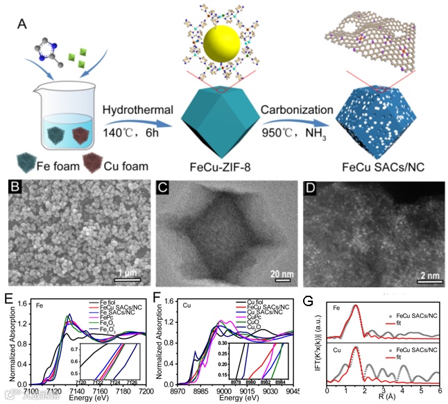 利用Fe和Cu泡沫金属代替传统的金属盐的方法制备了Fe和Cu双原子掺杂的ZIF-8(FeCu-ZIF-8),进一步通过氨气氛围下热解获得双金属单原子FeCu SACs/NC催化剂。同时,X射线吸收光谱证实了所制备双金属单原子催化剂中Fe和Cu分别以Fe-N4和Cu-N4配位形式共存,并且证实了铁和铜之间发生电荷转移,从而导致Fe的价态增加和Cu的价态降低。