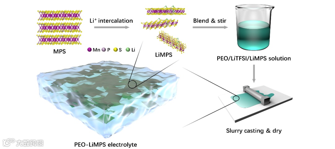 图1. 二维材料LiMPS插层锂化与PEO-LiMPS电解质制备工艺示意图