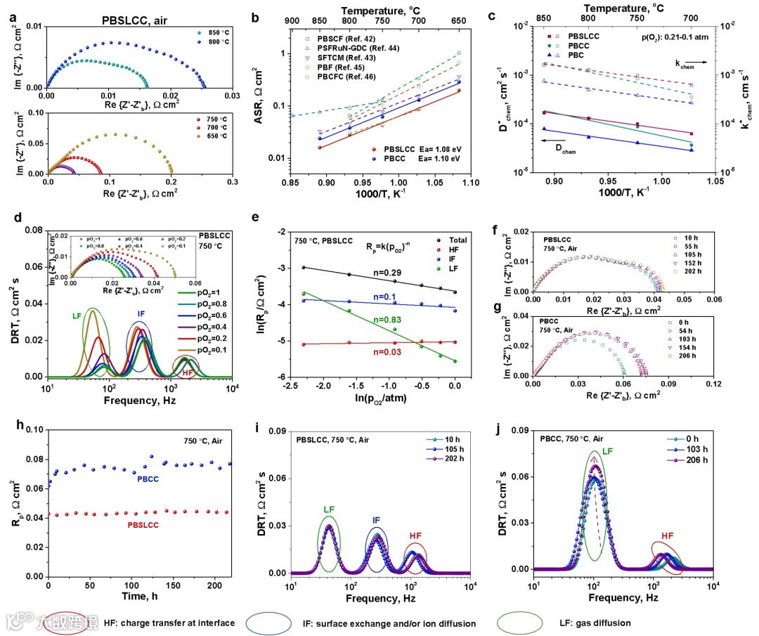 图2a和2b为高熵PBSLCC电极的对称电池的电化学阻抗谱(EIS)及电化学性能对比;图2c-2e为高熵PBSLCC电极的氧扩散和氧交换能力分析(D*chem and k*chem);图2f-2j为高熵PBSLCC电极的对称电池的电化学稳定性测试。