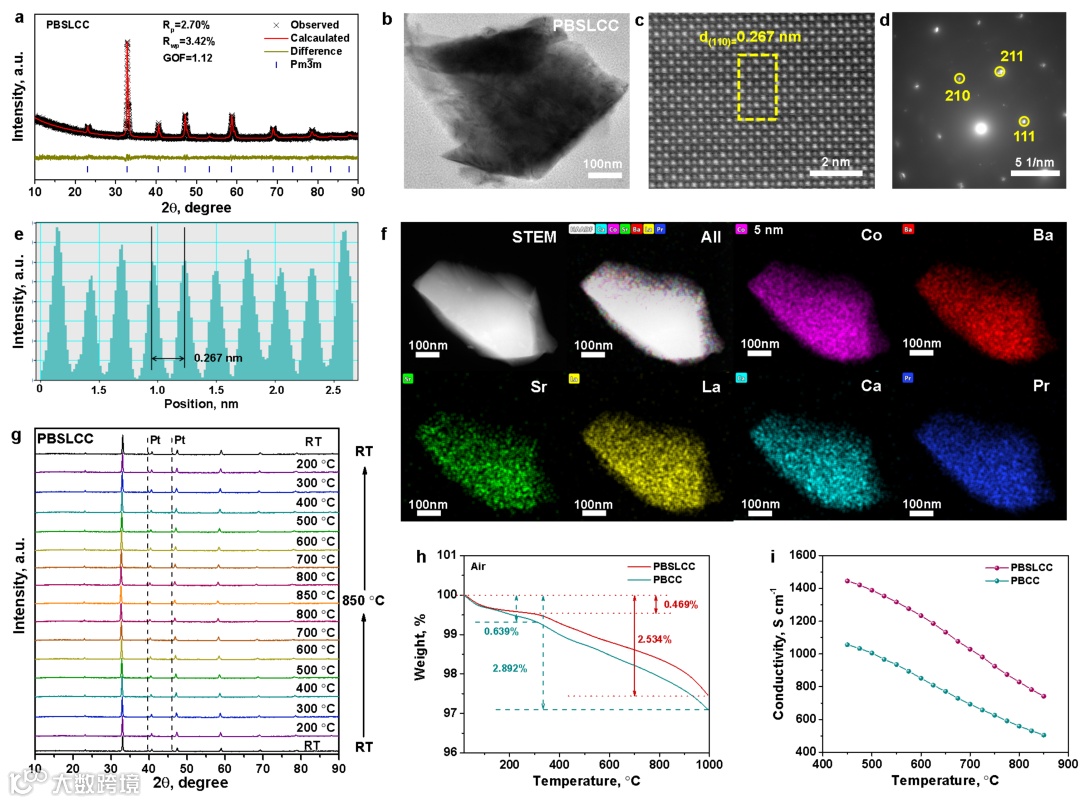 通过XRD Rietveld精修证明高熵PBSLCC成功合成(图1a);通过STEM图像、高分辨率TEM图像,颗粒的SAED图像,(c)中黄色框内的线性扫描轮廓,和PBSLCC晶粒的STEM-EDX,进行了高熵PBSLCC材料的微观分析(图1b-f);从室温到850℃测量的PBSLCC粉末的高温XRD衍射图(图1g)。图1h和1i是高熵PBSLCC材料的理化性能:(h)PBSLCC和PBCC样品从室温到1000 °C之间的热重(TG)曲线。(i) PBSLCC和PBCC样品在450-850 °C空气中的电导率。
