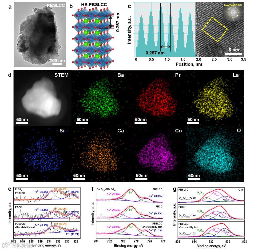 通过STEM(图4a),HR-TEM(图4c),TEM-EDX(图4d)和XPS(图4e-g)证明了在长期电化学测试结束后高熵钙钛矿PBSLCC的结构稳定性。