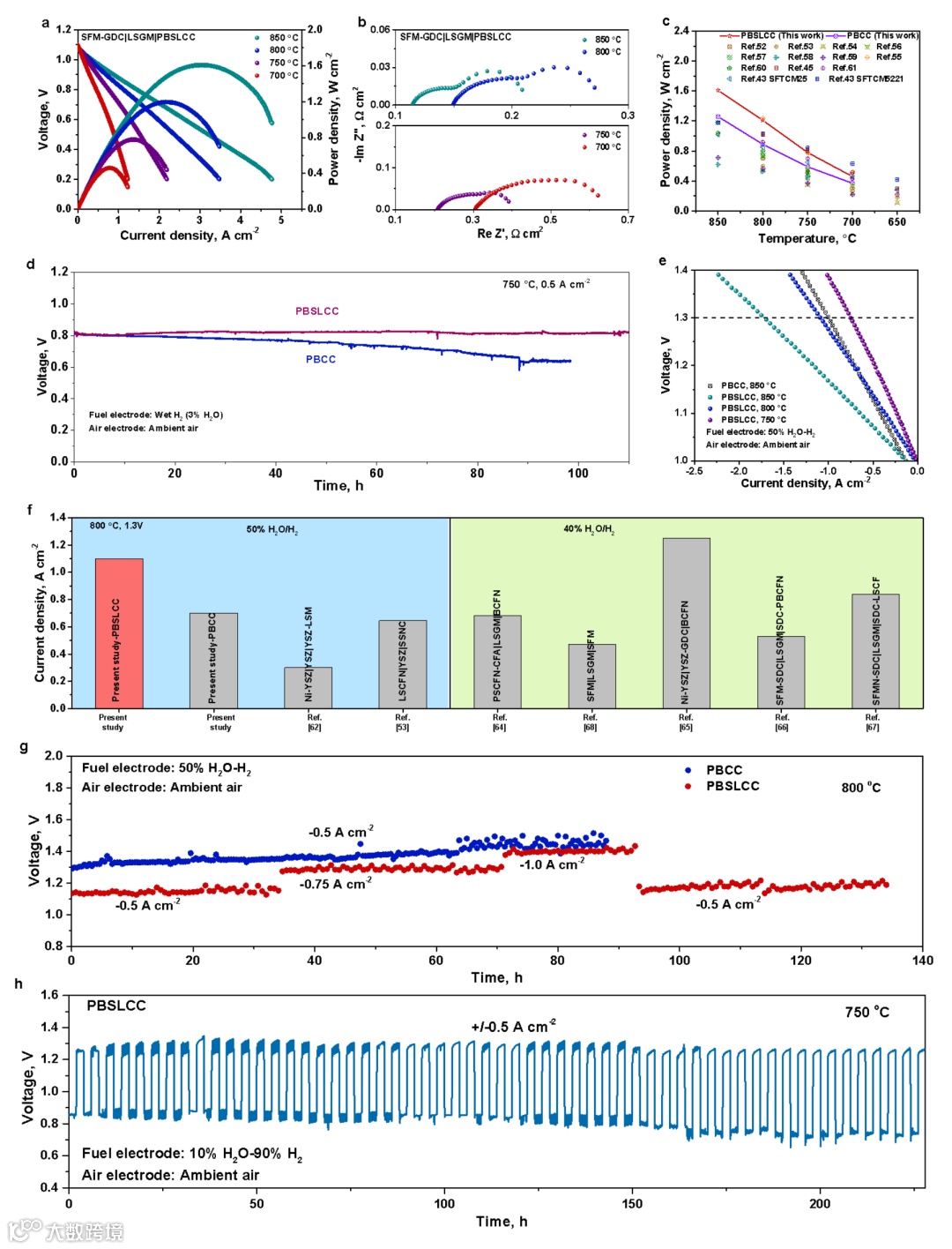 图3a-c为以PBSLCC为电极的单电池的电化学性能测试(I-V和EIS)和性能对比;图3d为以PBSLCC为电极的单电池的电化学稳定性测试(fuel-cell mode);图3e和3f为以PBSLCC为电极的单电池的电解性能和性能对比;图3g为以PBSLCC为电极的单电池的电解稳定性测试(electrolysis-cell mode);图3h为R-SOEC的电化学可逆循环测试。