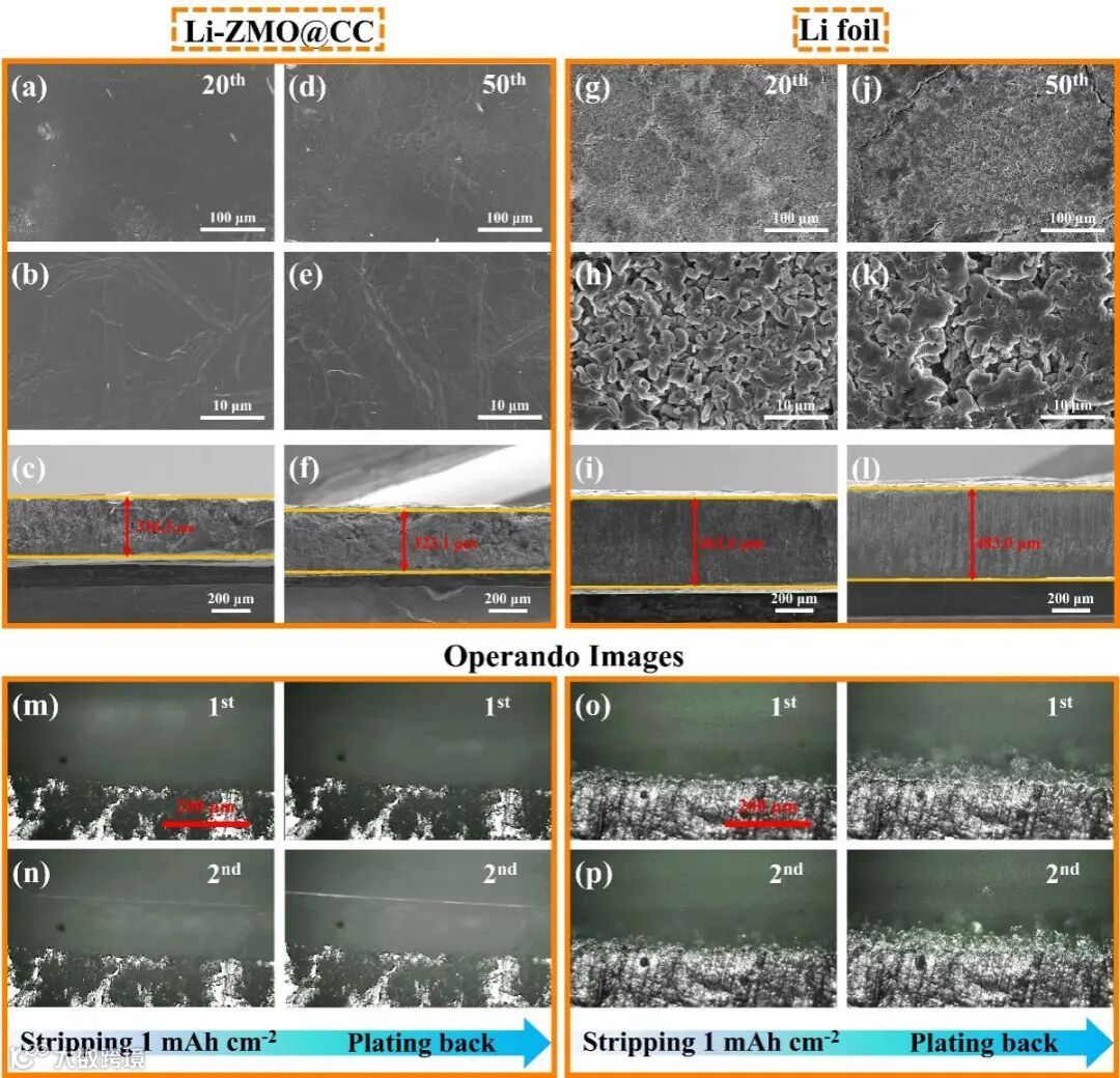 通过非原位SEM技术对Li-ZMO@CC在循环过程中的形貌演化进行了研究。在锂持续剥离到15 mAh cm-2时,电极表面暴露出完整的三维框架,表明了锂的均匀剥离。当锂再次沉积达到15 mAh cm-2时,电极展现出完整且均匀的表面锂层。进一步对比观察Li-ZMO@CC与锂箔在循环后的表面与截面可以看到,Li-ZMO@CC能够保持平整的表面形貌,而锂箔在循环二百圈后,表面出现极不均匀的孔洞并伴随着大量“死锂”。随这种均匀的锂剥离/电镀行为可归因于以下优点: