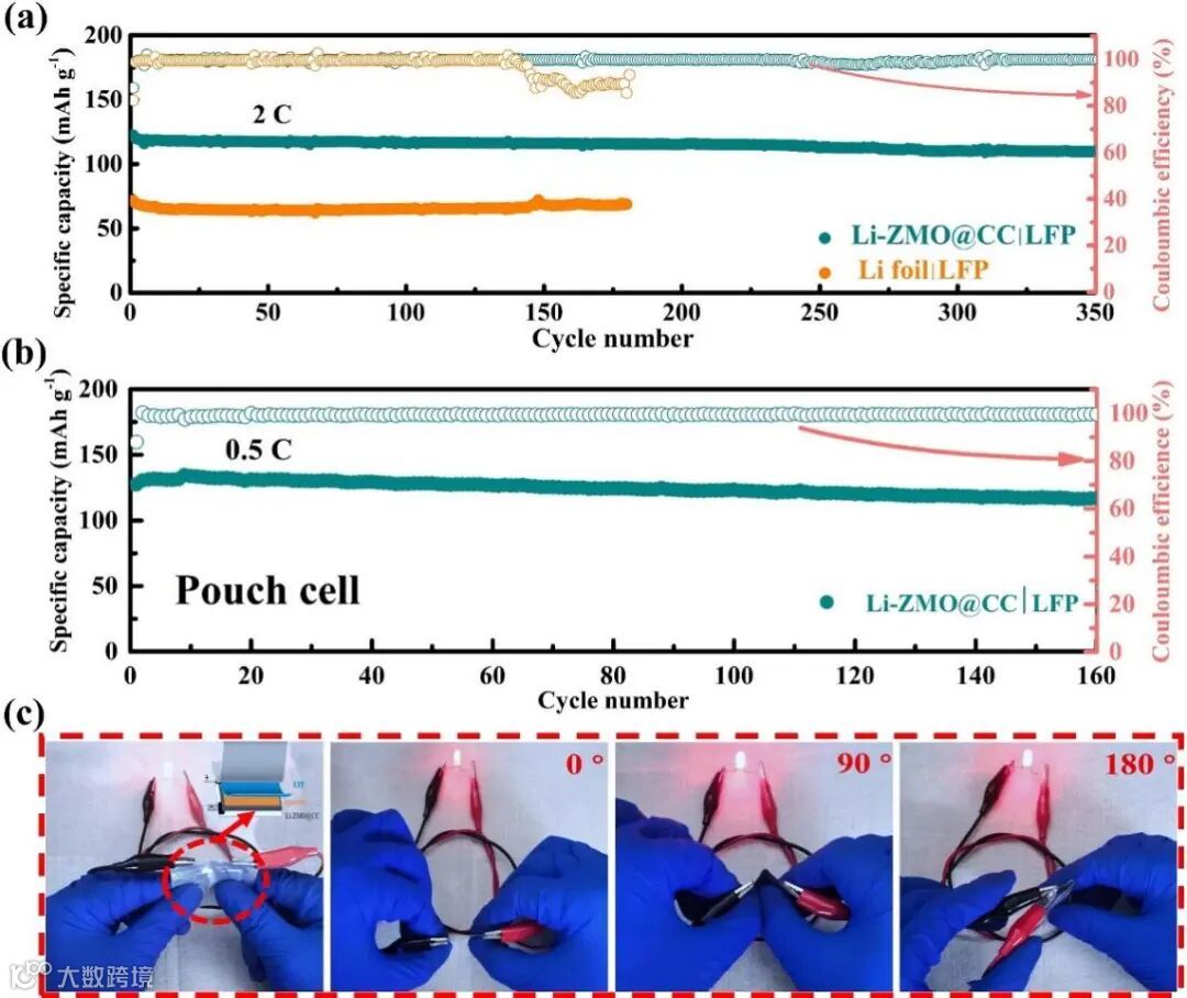 图5. Li-ZMO@CC|LFP全电池循环性能与柔性性能测试。