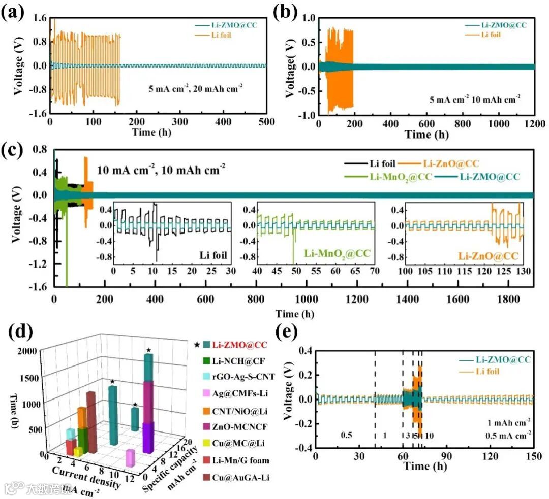 (1) 优异的亲锂性和均匀分布的 ZMO纳米颗粒可以诱导锂的完整均匀注入。