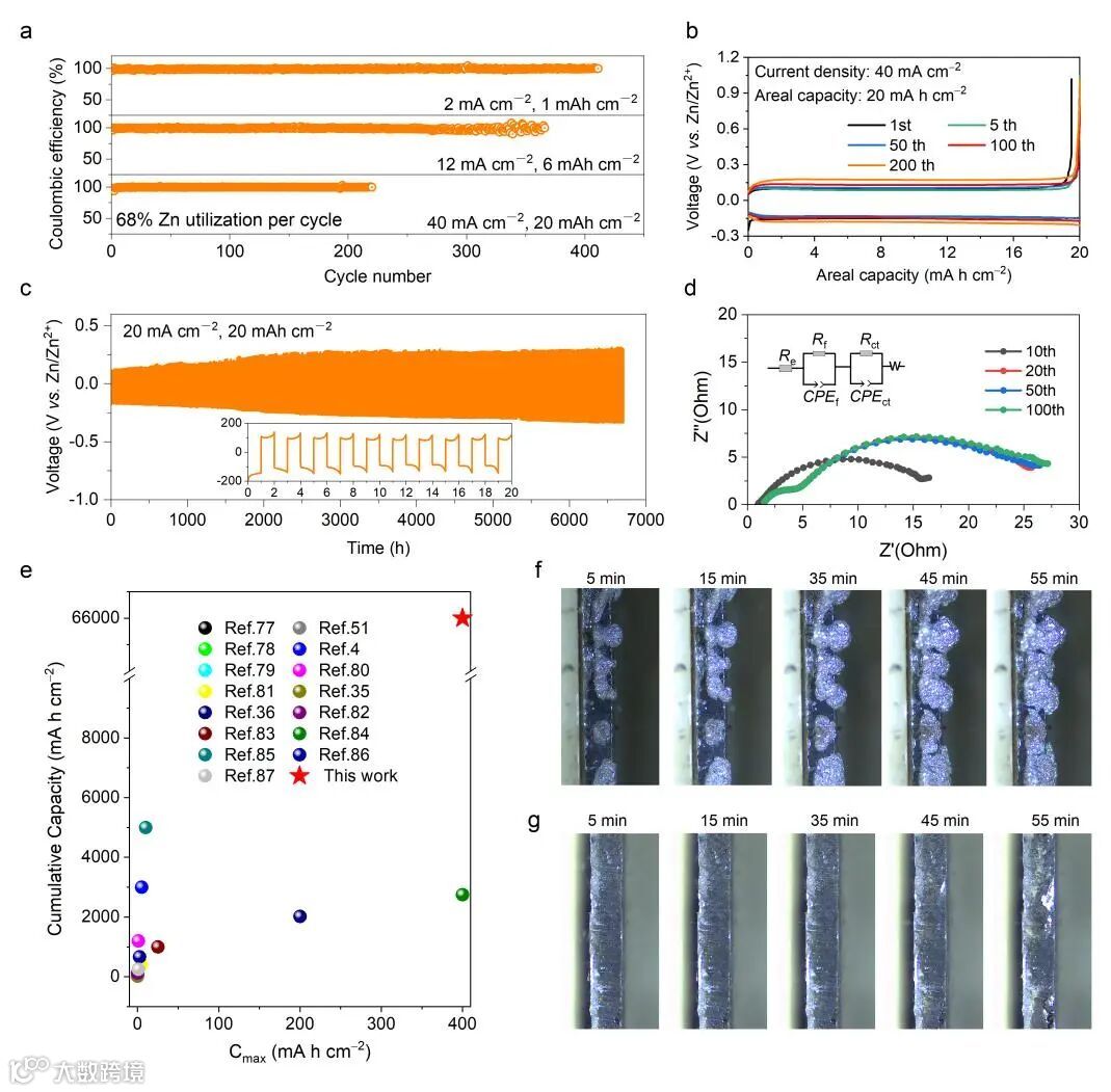 金属电池的商业化目标是≥5mAh cm-2、电流密度为10mA cm-2、阳极每个循环的利用率≥80%。以此为目标,进一步评估优化后电解液的实际应用价值。