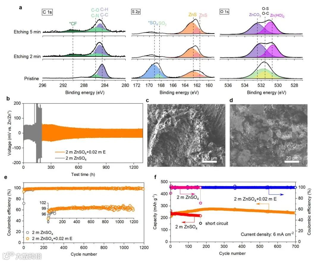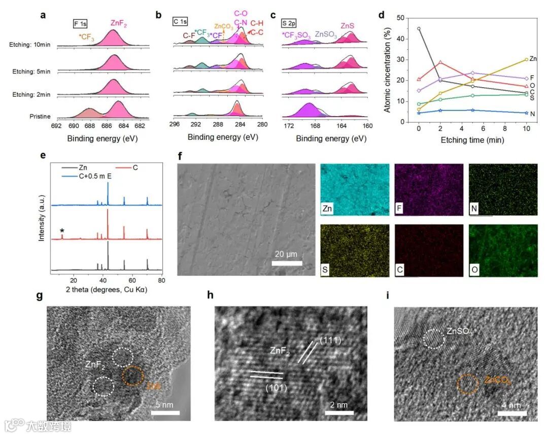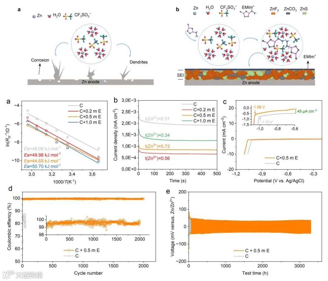 图1. 锌阳极界面不稳定机理,以及通过1-乙基-3-甲基咪唑离子构建富含ZnF2/ZnS界面的示意图。