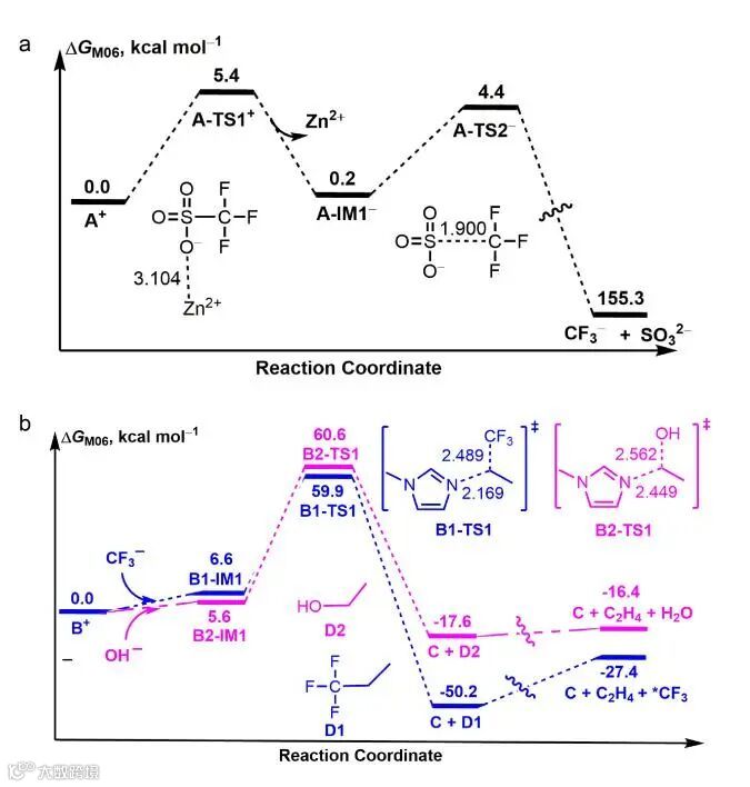 通过将1-乙基-3-甲基咪唑盐引入Zn(CF3SO3)2 或ZnSO4电解液中,在锌阳极界面局域碱性环境中加速C-F键断裂形成富含ZnF2/ZnS界面层,削弱活化能垒,提高Zn2+迁移数到0.72,且1-乙基-3-甲基咪唑离子优先吸附在锌阳极表面,限制了枝晶的生长。1-乙基-3-甲基咪唑离子的双功能作用提高了水系锌离子电池的可逆性,即使在贫阳极 (N/P=1.73)、贫电解液和高负载量(6 mAh cm-2)的情况下仍能维持电池运作数百周,对锌离子电池开发具有重要作用。