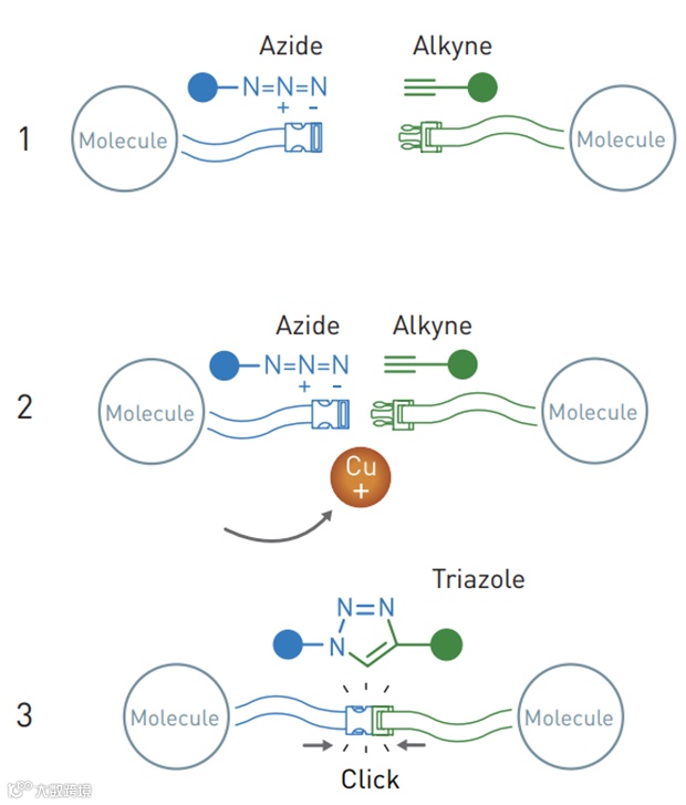 Source: © Johan Jamestad/The Royal Swedish Academy of Sciences 添加铜离子后,叠氮化物和炔烃之间的点击化学反应非常高效。该反应 (CuAAC) 现已被全球各地的科学家们广泛使用,能以十分简便的方式将不同分子连接到一起