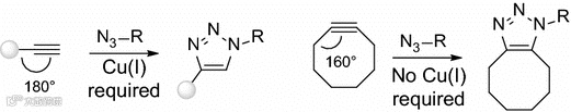 Source: Topics in Current Chemistry 374(1) DOI: 10.1007/s41061-016-0010-x 线性炔烃和高张力的环辛炔在 C–C≡C 的键夹角方面的差异,后者可实现无需铜催化的点击化学反应