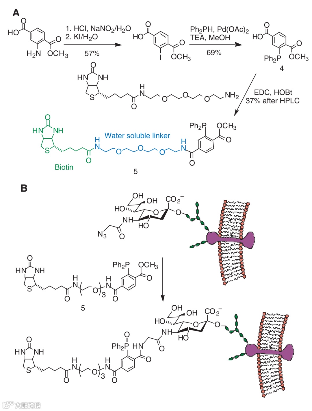 Bertozzi 等报道的有机膦分子和叠氮化物在细胞表面的 Staudinger 反应