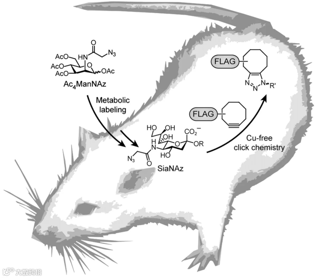 IMAGE SOURCE: Carolyn R. Bertozzi et al., Copper-free click chemistry in living animals, PNAS, 2010, 5, 1821-1826 甘露糖胺 (mannosamine) 是细胞表面的一种糖分子。在对其上的全部羟基进行乙酰化修饰并标记上叠氮 (N₃) 基团后得到的 N-azidoacetylmannosamine (Ac₄ManNAz) 会在生物体内被转化为叠氮乙酰基唾液酸 (azide-tagged sialic acid, SiaNAz)。然后再注射入带有 FLAG(一种标记肽)的环辛炔分子;由于这个分子中的炔基(C≡C 键)能和叠氮 (N₃) 基团发生“点击”(click) 反应,因此,当这个 FLAG 标记的分子游走到 SiaNAz 分子附近时,Duang,它们会就会结合在一起了。于是这个 FLAG 标记也就被添加到了 SiaNAz 分子上,这样就能知道 SiaNAz 分子在各个组织和器官中的分布情况等信息了。 所谓“正交”其实是有互不干涉的意思。之所以叫生物正交化学,就是指这两个分子上进行的化学修饰都不影响其各自在生物体内的代谢,也不和其它分子结合,所以分别注射了这两种分子后,它们也只会和对方反应结合。当然还有一些别的要求,比如反应的速度要足够快,这样才能让标记物(如此例中带 FLAG 标记的环辛炔分子)在想要发生“生物正交”的分子被代谢前就能找到它并与之“紧密结合”。 以上文字(蓝色)改编自:https://www.zhihu.com/question/35989109/answer/65381310