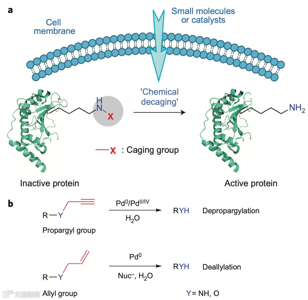 类似于有机合成中使用的脱保护基策略,陈鹏教授的团队发展出了一种蛋白,其活性位点的关键残基被一种能抑制蛋白活性的保护基团所“笼罩”。可以通过生物正交的断键反应将这一笼子剪掉,从而使蛋白质脱保护以将其激活。“我们早在 2014 年就报道了第一个例子,即使用钯介导的脱笼化学手段 (chemical decaging)”,陈鹏教授解释到。在钯的催化下,蛋白活性位点上的笼状赖氨酸残基发生断键,分裂出炔丙基氨基甲酸酯。“这是通过金属对生物分子进行脱保护以实现功能化的首次报道,表明我们可以对活细胞中的蛋白质活性进行操控。”