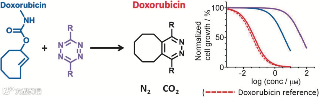 无金属的生物正交断键反应现在也已经被实现了,主要的实现手段就是对已被证明可实现生物正交成键的反应进行改造。2013 年,由荷兰 Tagworks 制药公司的 Marc Robillard 领导的一个团队证明,TCO-四嗪化学可以适用于断键反应。如果在 TCO 分子的烯丙位连接上氨基甲酸酯基团,那么该侧基就能通过环加成引发的重排反应,以游离胺的形式被释放。该研究团队的工作表明该反应可被用于在活细胞中按需释放抗癌药物阿霉素 (doxorubicin)。