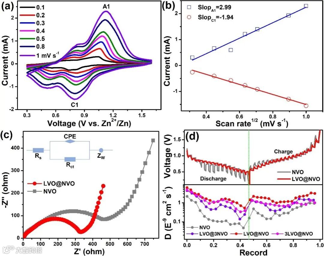 电极材料优异的电化学性能与其反应动力学具有密切的联系。因此,通过CV、EIS、GITT等对电极的反应动力学进行了分析。结果表明,相比于NVO,LVO@NVO电极表现出更高的赝电容、更快的电荷转移/离子扩散动力学。