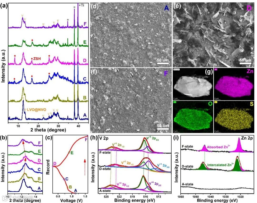 最后,结合离位XRD、SEM以及XPS等对LVO@NVO电极的能量存储机理进行了探究。结果表明,LVO@NVO电极在放/充电过程中,Zn2+、H+共嵌入/脱出,并伴随金属钒的还/氧化原以及碱式硫酸锌(ZSH)微米片在电极表明的沉积/溶解。