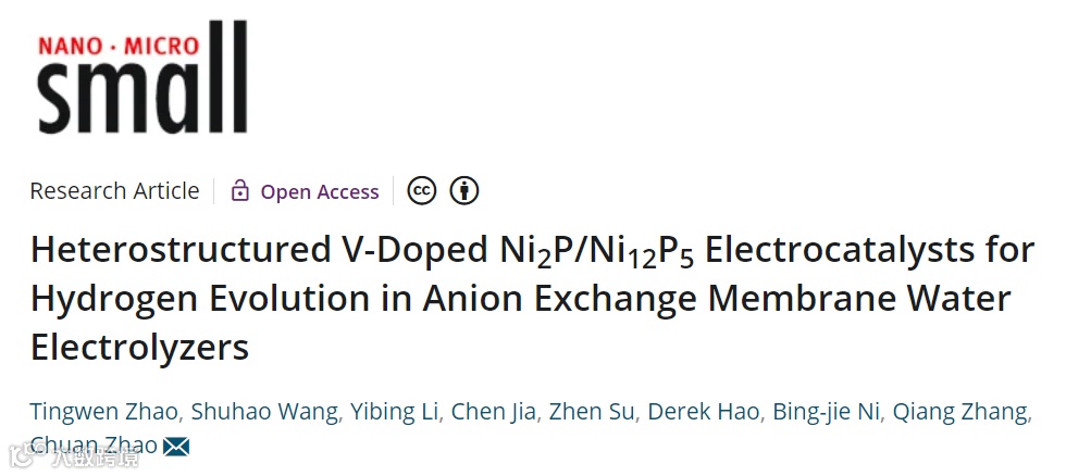 基于此,新南威尔士大学赵川教授课题组在Small 上报道题为“Heterostructured V-Doped Ni2P/Ni12P5 Electrocatalysts for Hydrogen Evolution in Anion Exchange Membrane Water Electrolyzers”的研究工作。