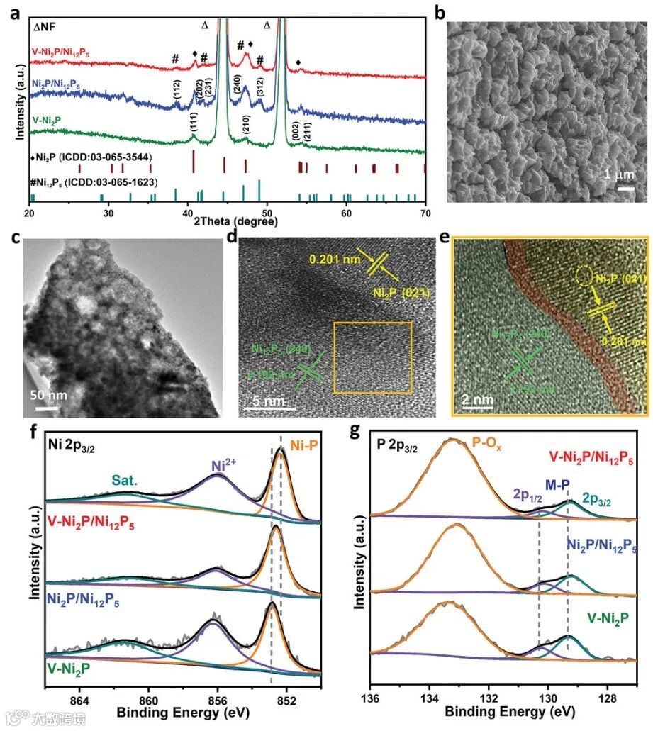 图1. V-Ni2P/Ni12P5异质结催化剂结构表征