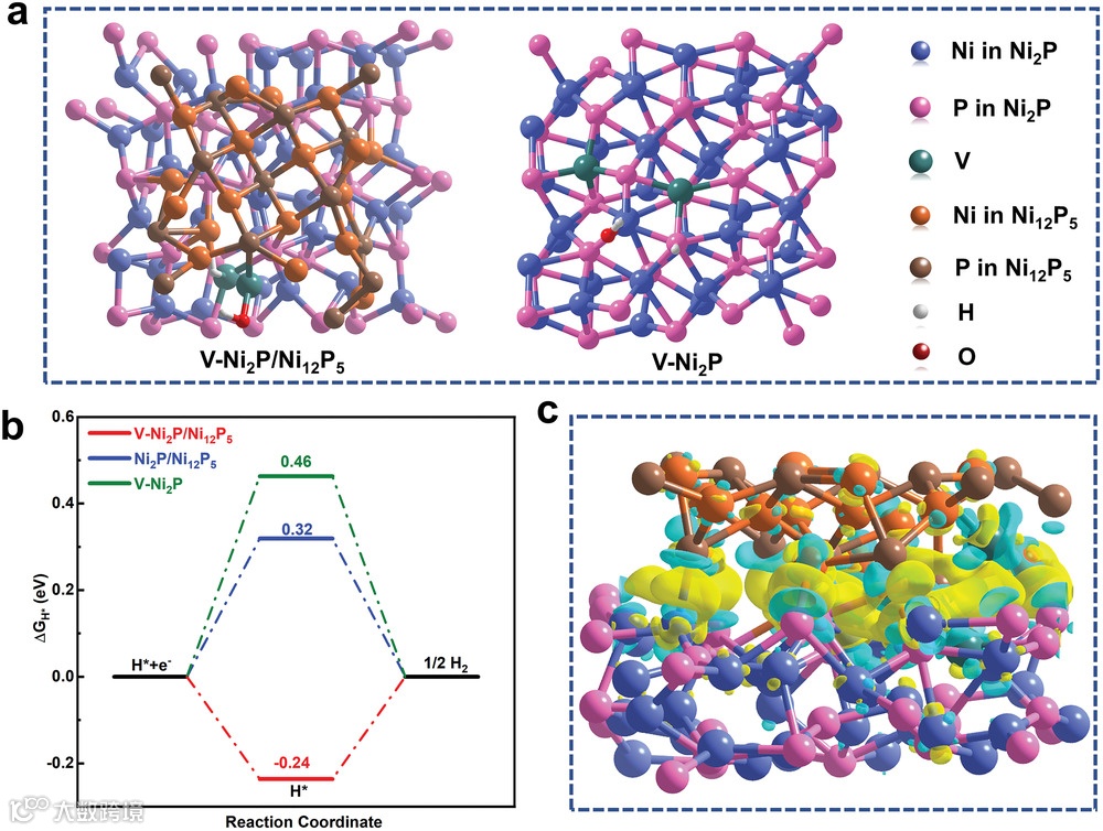 理论计算表明V-Ni2P/Ni12P5异质结的构建有利于提升电子导电性以及界面处的电子转移,并且诱导电子从P位点向Ni-V桥键的转移,从而使得Ni位点获得更多的电子。DFT计算表明,V掺杂和异质结的协同作用有利于V-Ni2P/Ni12P5催化剂具有更小的水解离能垒和更优的吸附能。