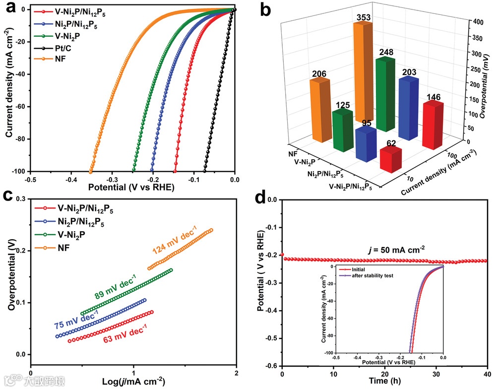 图2. V-Ni2P/Ni12P5电极HER活性研究