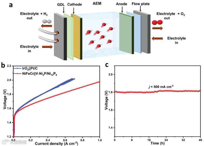 图3. V-Ni2P/Ni12P5电极在AEM电解水中活性研究