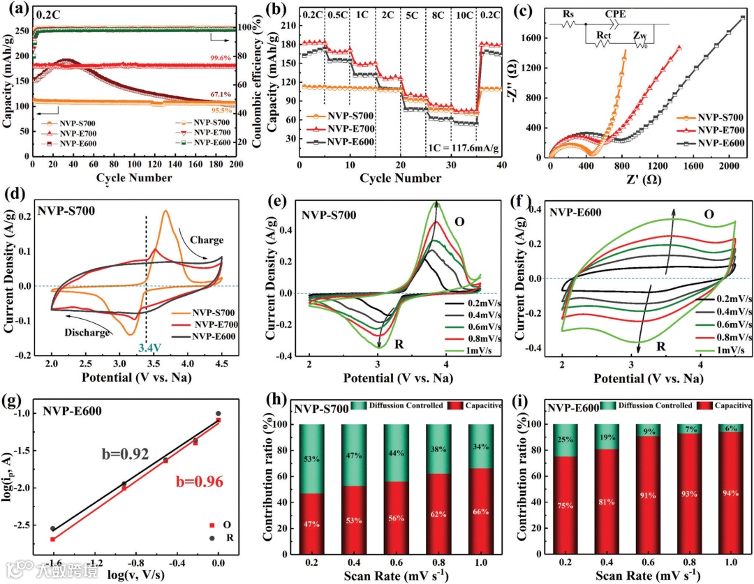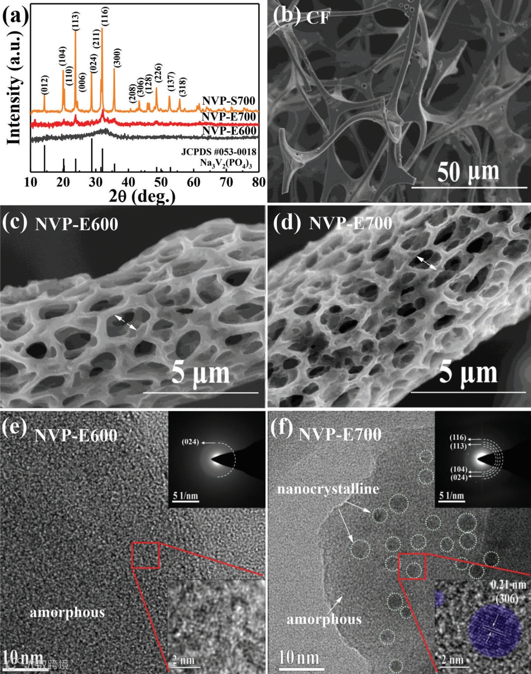 利用静电喷雾法在泡沫碳衬底上沉积Na3V2(PO4)3前驱体,通过控制退火温度调节 Na3V2(PO4)3的结晶度,获得了系列纳米晶和无定形相共存的 Na3V2(PO4)3材料NVP-E600和NVP-E700,退火温度分别为600和700摄氏度。