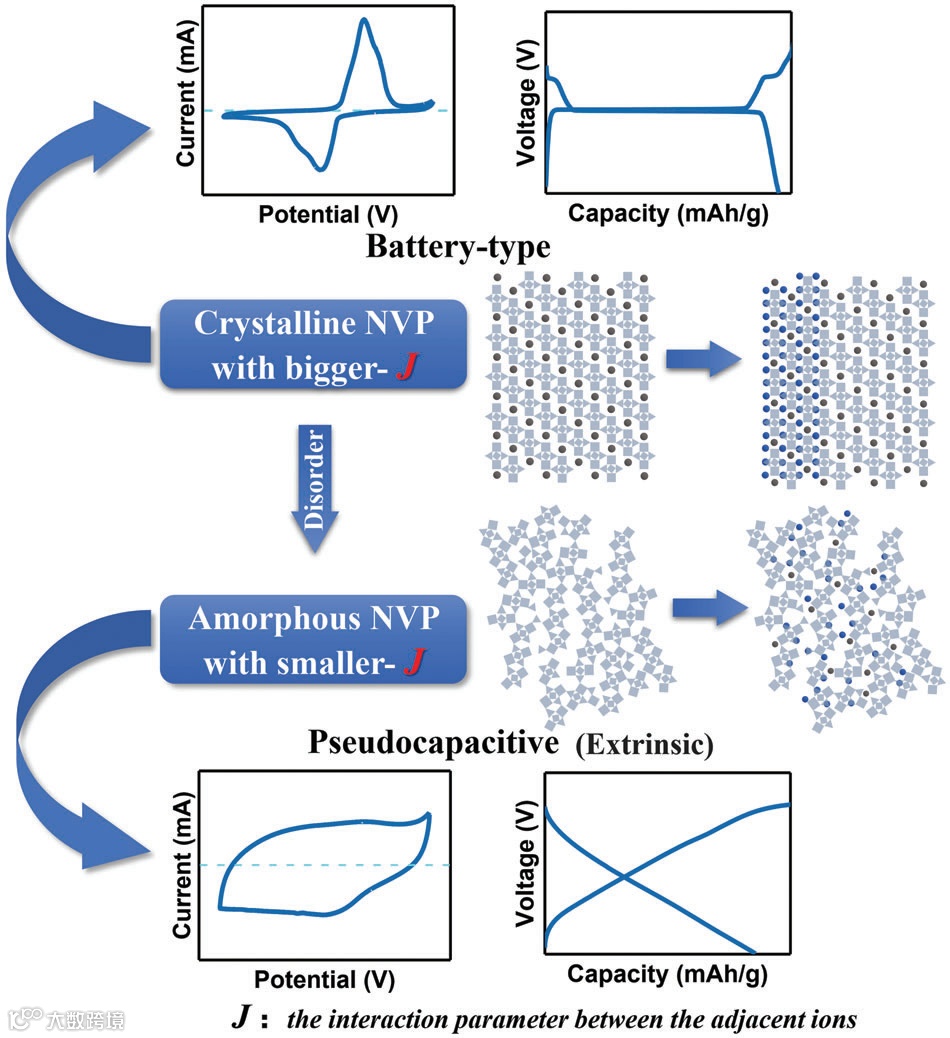 通过对比不同结晶度Na3V2(PO4)3材料的电化学性能,发现提高无序度可以使材料由电池型材料转变为赝电容型,这种无序诱导产生的非本征赝电容行为可归因于:无序结构的引入改变了Na3V2(PO4)3材料中钠离子之间的相互作用,使得充放电过程由原本的两相反应转变为单相反应,导致充放电曲线中平台的消失和 CV 曲线的矩形化,材料中电荷存储主要表现为赝电容行为。